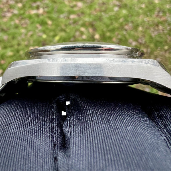 The watch is in good overall condition, with some signs of wear consistent with its age. The bracelet and case show minor scuffs, and the movement requires servicing for optimal timekeeping accuracy.