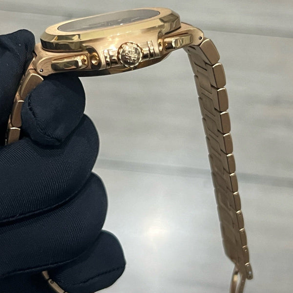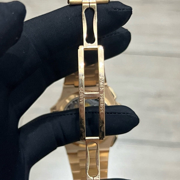 This Patek Philippe Nautilus 5980/1R is in pristine condition, showcasing a flawlessly maintained rose gold case, bracelet, and dial. Fully serviced and operating at peak performance, this timepiece is a true statement of elegance and functionality, ready for its next discerning owner.